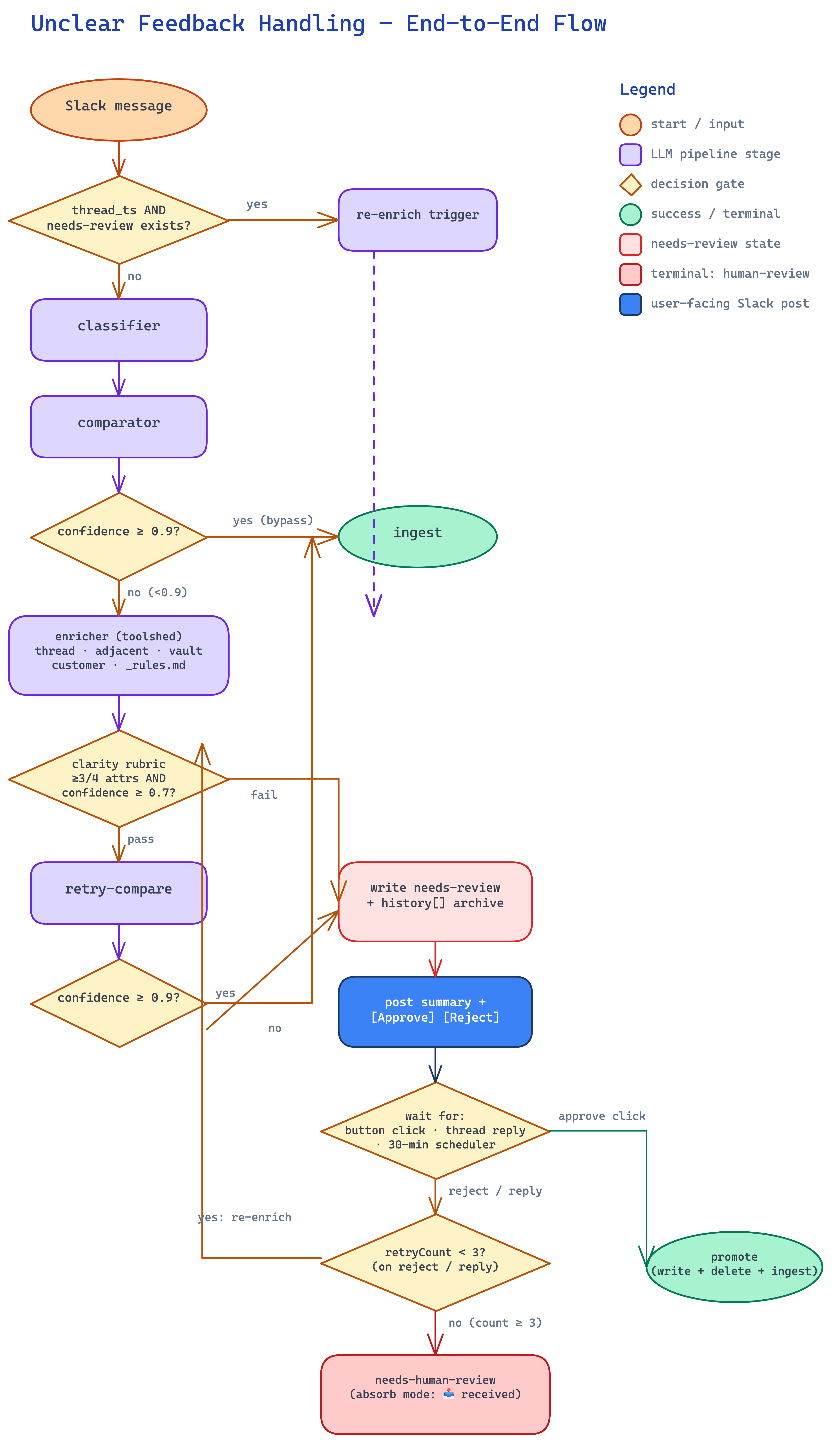 Slack message → classifier → comparator → 0.9 confidence gate → enricher (toolshed) → clarity rubric (≥3/4 + ≥0.7 gate) → retry-compare → ingest OR needs-review → Approve/Reject buttons → thread reply / 30-min scheduler → promotion OR needs-human-review absorb.