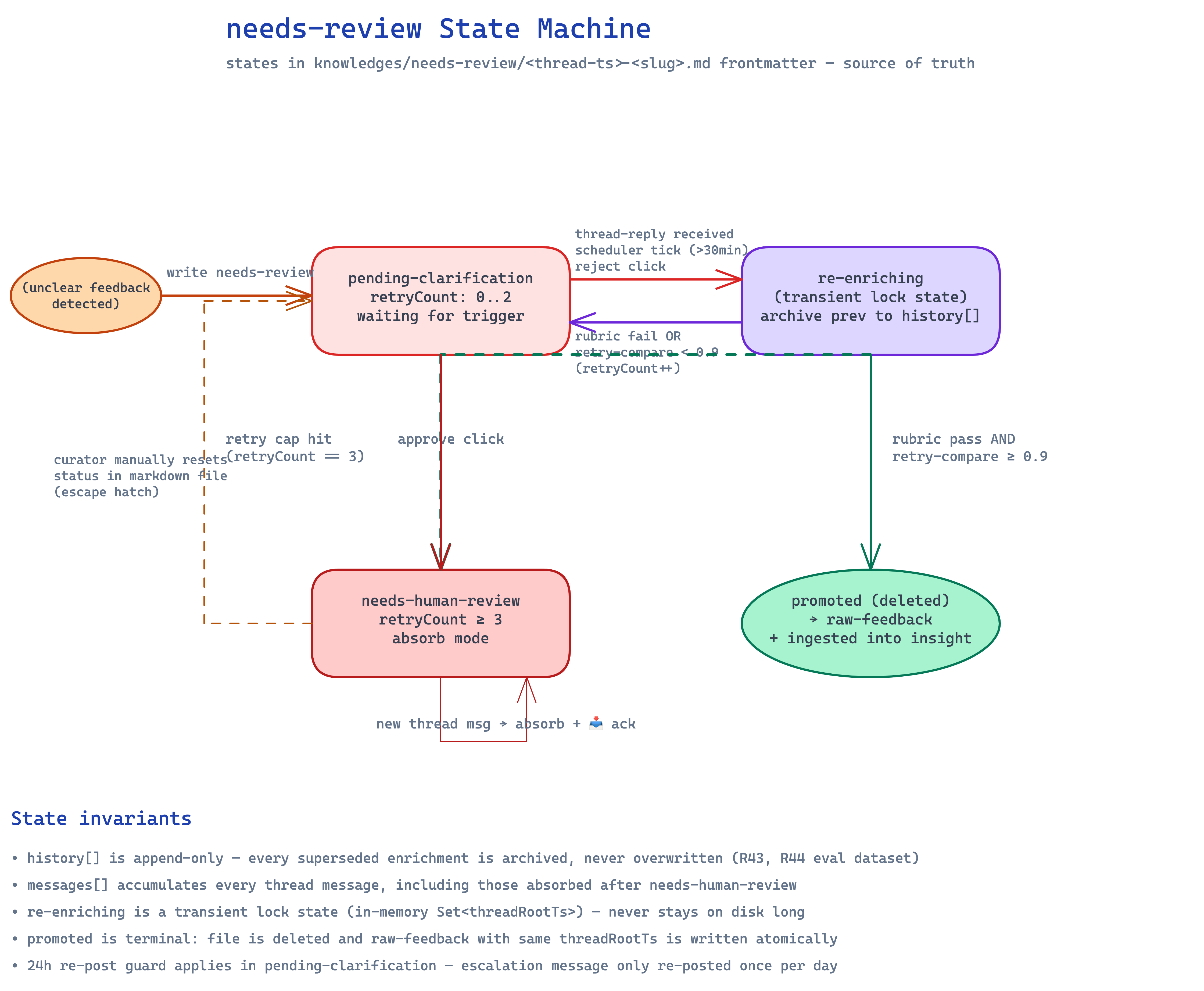 State transitions between pending-clarification, re-enriching, needs-human-review, and promoted (deleted) with trigger labels and state invariants.