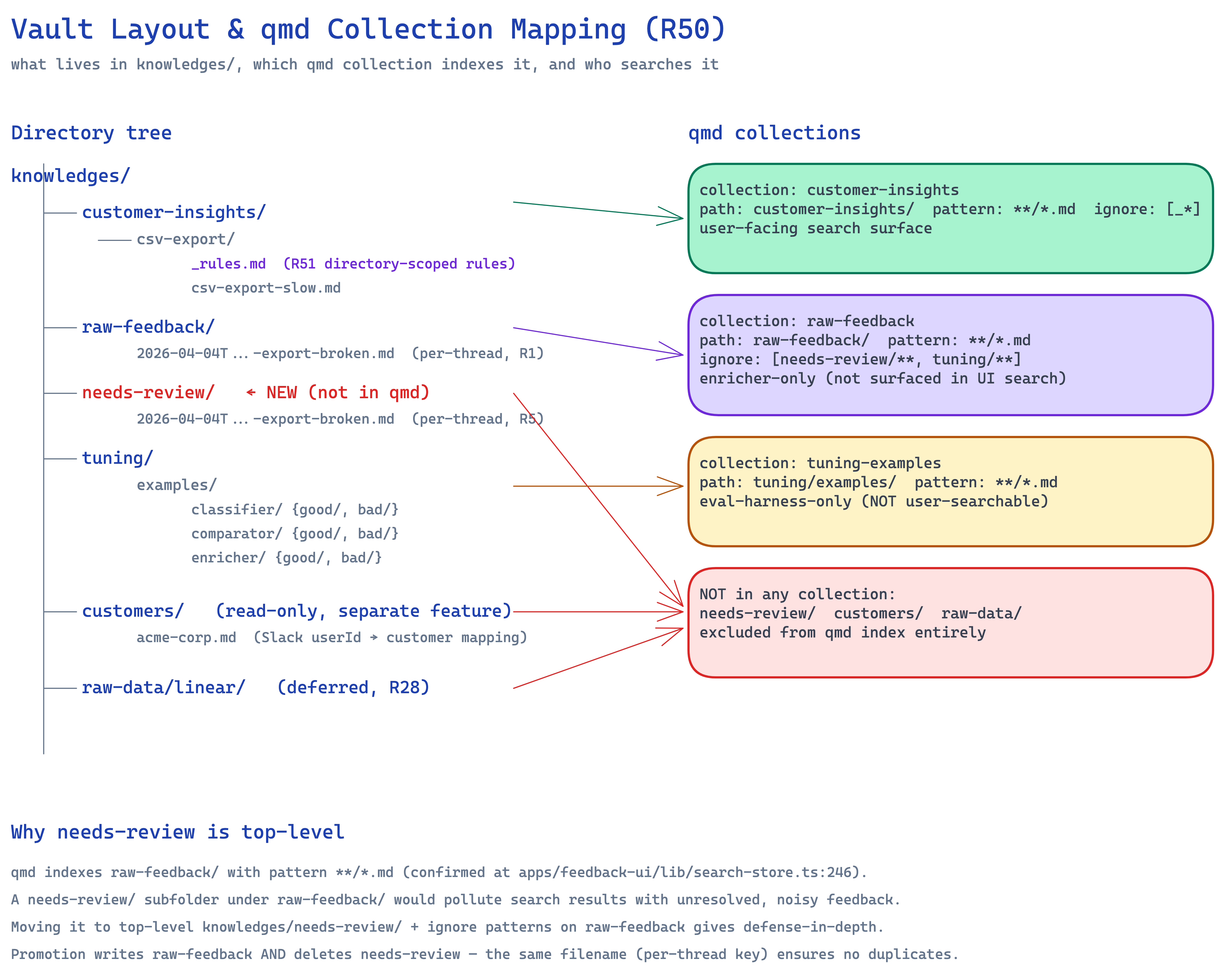 Directory tree of knowledges/ with qmd collection boxes showing which folders each collection indexes and their ignore patterns. Explains why needs-review lives at top-level.